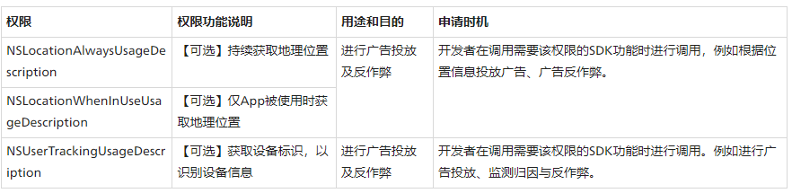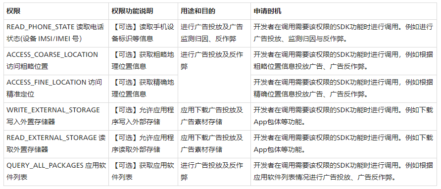 接入說(shuō)明:對(duì)于芒果聯(lián)盟SDK可選申請(qǐng)的系統(tǒng)權(quán)限,您可以參考相關(guān)如下表格的內(nèi)容,詳細(xì)了解相關(guān)權(quán)限與各業(yè)務(wù)功能的關(guān)系及其申請(qǐng)時(shí)機(jī),因相關(guān)權(quán)限的不申請(qǐng)將會(huì)對(duì)其對(duì)應(yīng)的功能造成影響,您可以結(jié)合業(yè)務(wù)實(shí)際需要進(jìn)行合理配置。